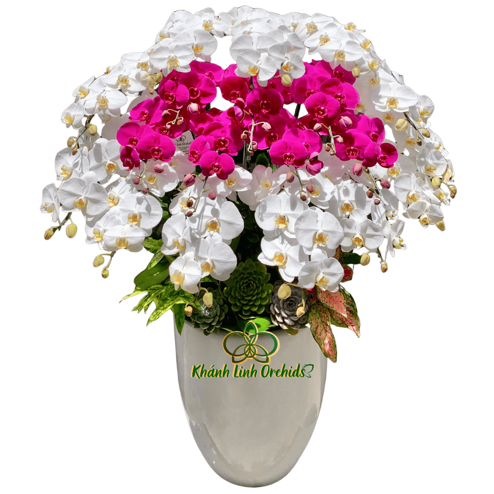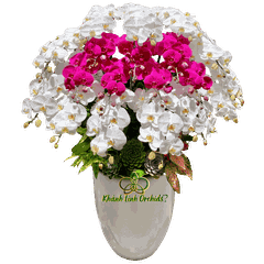 20 cành hoa được bố trí cân đối, tầng trên là sắc trắng tinh khôi gợi sự thanh lịch, tầng dưới là sắc tím đậm nổi bật, tạo hiệu ứng tương phản đầy ấn tượng. Sự phối hợp hài hòa này không chỉ mang tính thẩm mỹ cao mà còn gửi gắm ý nghĩa phong thủy may mắn: màu trắng biểu trưng cho sự khởi đầu mới, sự an yên, còn màu tím đậm tượng trưng cho sự thịnh vượng, quý phái và bền lâu.