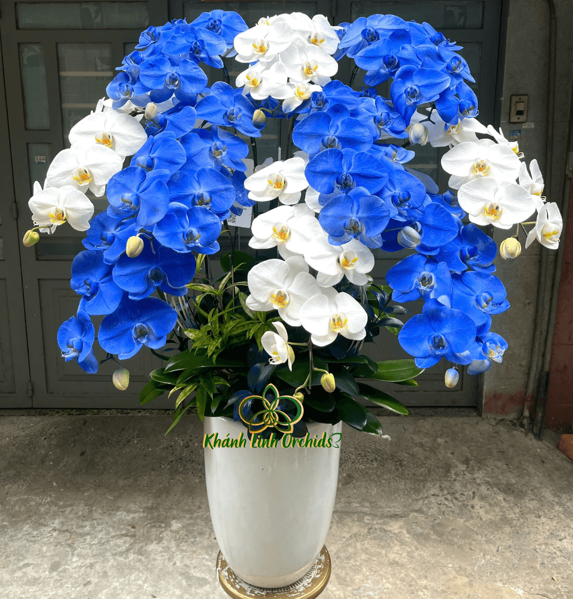Mười cành lan được tuyển chọn và cắm tỉ mỉ trong chậu cao trắng, thanh thoát và đậm chất nghệ thuật. Sắc trắng tượng trưng cho sự thuần khiết, thanh cao, trong khi sắc xanh dương điểm xuyết gợi cảm giác bình yên, trí tuệ và niềm hy vọng.