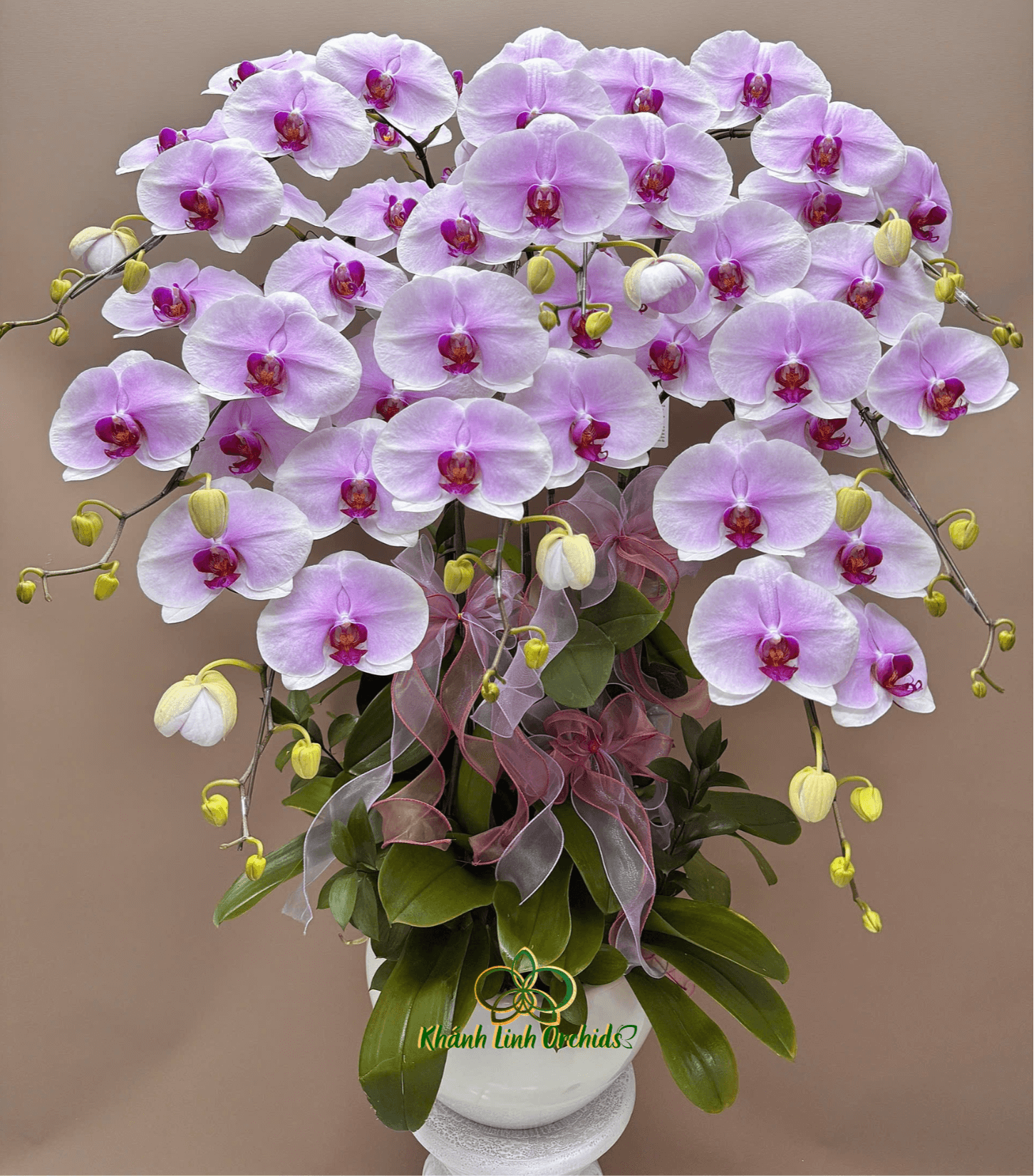 Được cắm trong chậu sứ trắng thấp hiện đại, chậu lan tạo cảm giác hài hòa với mọi không gian trưng bày. Nổi bật trên nền xanh của lá là dải nơ voan mỏng nhẹ, được phối khéo léo làm tăng thêm nét mềm mại và cuốn hút cho tổng thể. Thiết kế chậu tuy đơn giản nhưng tinh tế, phù hợp để trang trí bàn tiếp khách, bàn làm việc hoặc làm quà tặng ý nghĩa.