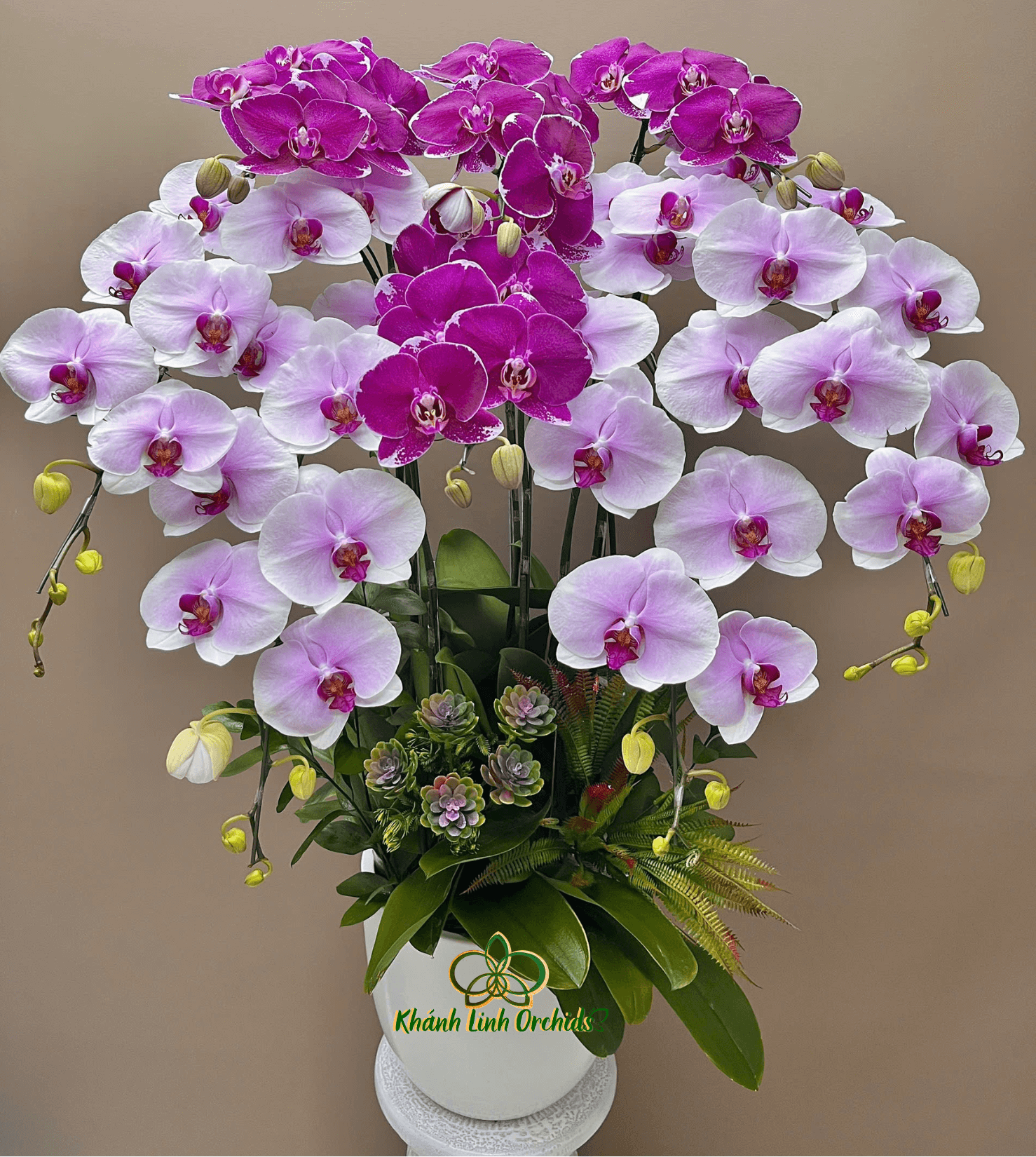 Chậu sứ trắng cao cấp mang thiết kế tối giản, tôn lên vẻ đẹp thanh lịch của từng cành hoa. Phần gốc chậu được điểm xuyết bằng các loại sen đá đa màu sắc và cây lá trang trí, giúp chậu hoa thêm sinh động và hài hòa về bố cục. Mỗi chi tiết đều được chăm chút tỉ mỉ, phản ánh sự chuyên nghiệp và tâm huyết của đội ngũ cắm hoa tại Hoa lan Khánh Linh.