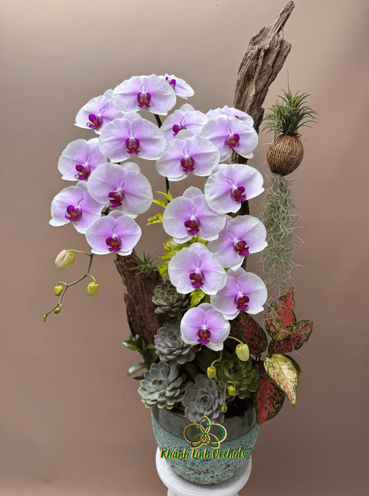 Chậu hoa được kết hợp cùng lũa gỗ, sen đá, cây không khí và các loại lá màu, tạo nên bố cục hài hòa giữa hoa, cây và chất liệu thiên nhiên. Thiết kế chậu men rạn tông xanh rêu mang lại cảm giác cổ điển nhưng không kém phần hiện đại.