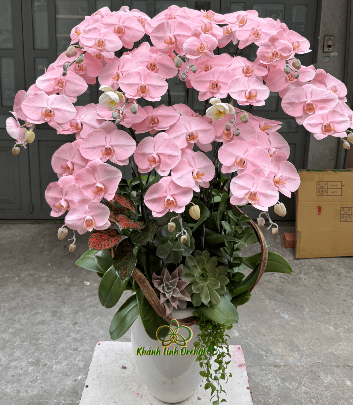 Mẫu lan hồ điệp trắng phun hồng pastel nhạt 10 cành này rất phù hợp để làm quà tặng cho phái nữ trong các dịp sinh nhật, mừng khai trương, lễ cưới hay ngày lễ đặc biệt. Ngoài ra, đây còn là điểm nhấn hoàn hảo cho bàn làm việc, sảnh tiếp khách hay phòng khách nhã nhặn, thanh lịch. Cành lan được bố trí cân đối, đổ nhẹ xuống tự nhiên, kết hợp cùng sen đá nhiều lớp và lá cảnh xanh tươi, tạo nên tổng thể hài hòa giữa mềm mại và chắc khỏe. Chậu cao trắng giúp nâng tầm vẻ đẹp tổng thể, đồng thời làm nổi bật tông màu pastel một cách trang nhã.