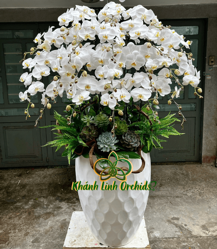 Chậu được cắm trong chiếc chậu xi măng trắng cao cấp, mang vẻ đẹp hiện đại và sang trọng, nổi bật với kết cấu cứng cáp, tạo điểm tựa vững vàng cho sự duyên dáng của hoa lan. Những cây sen đá xanh mát được trang trí khéo léo xung quanh gốc hoa, với hình dáng đầy đặn và sắc xanh ngọt ngào, mang đến sự tươi mới và sự sống động cho chậu hoa. Dây rừng uốn quanh một cách tự nhiên dưới sen đá , tạo nên một không gian sinh động và tràn đầy năng lượng. Các cây dương xỉ xanh tươi, hòa quyện cùng cây hoa lan, làm tăng sự hài hòa, đồng thời làm nổi bật vẻ đẹp tự nhiên và thanh thoát của chậu hoa.