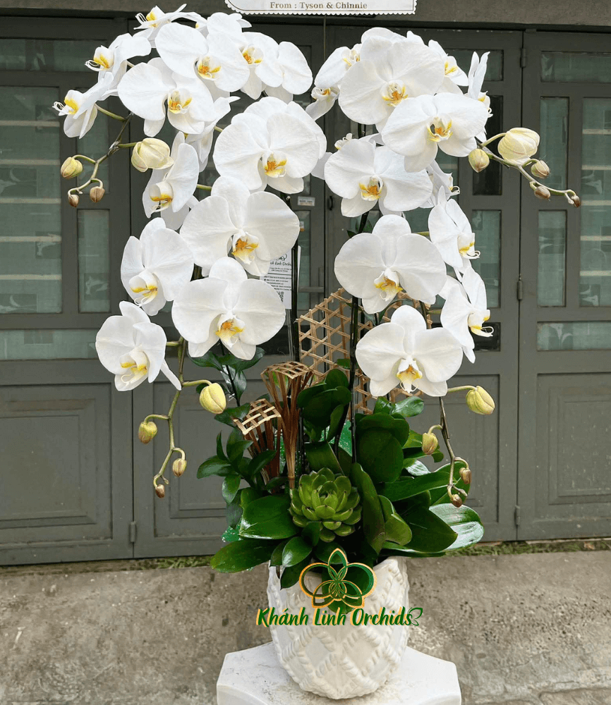 Chậu hoa được cắm trong chiếc chậu trắng thấp, mang đến vẻ đẹp tinh tế, giản dị nhưng không kém phần sang trọng. Đặc biệt, những miếng tre đan được trang trí xung quanh chân chậu, làm nổi bật thêm vẻ đẹp tự nhiên, gần gũi của sản phẩm. Chính giữa chậu là một cây sen đá xanh, tạo điểm nhấn đặc sắc, mang đến sự tươi mới và độc đáo cho cả chậu hoa. Sự kết hợp hoàn hảo giữa hoa lan trắng và cây sen đá xanh không chỉ tạo nên một vẻ đẹp hài hòa mà còn làm cho chậu hoa trở thành một món quà tuyệt vời, làm bừng sáng không gian sống của bạn.