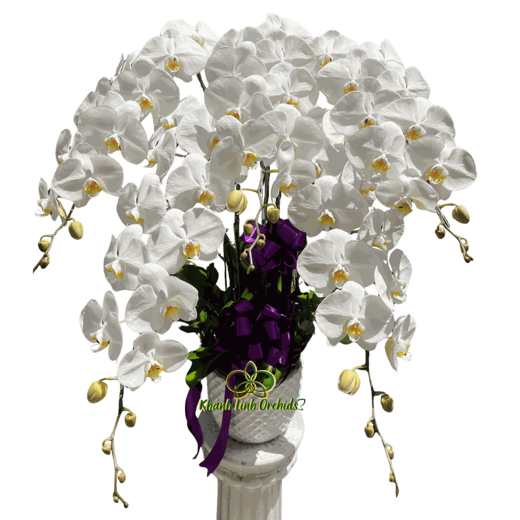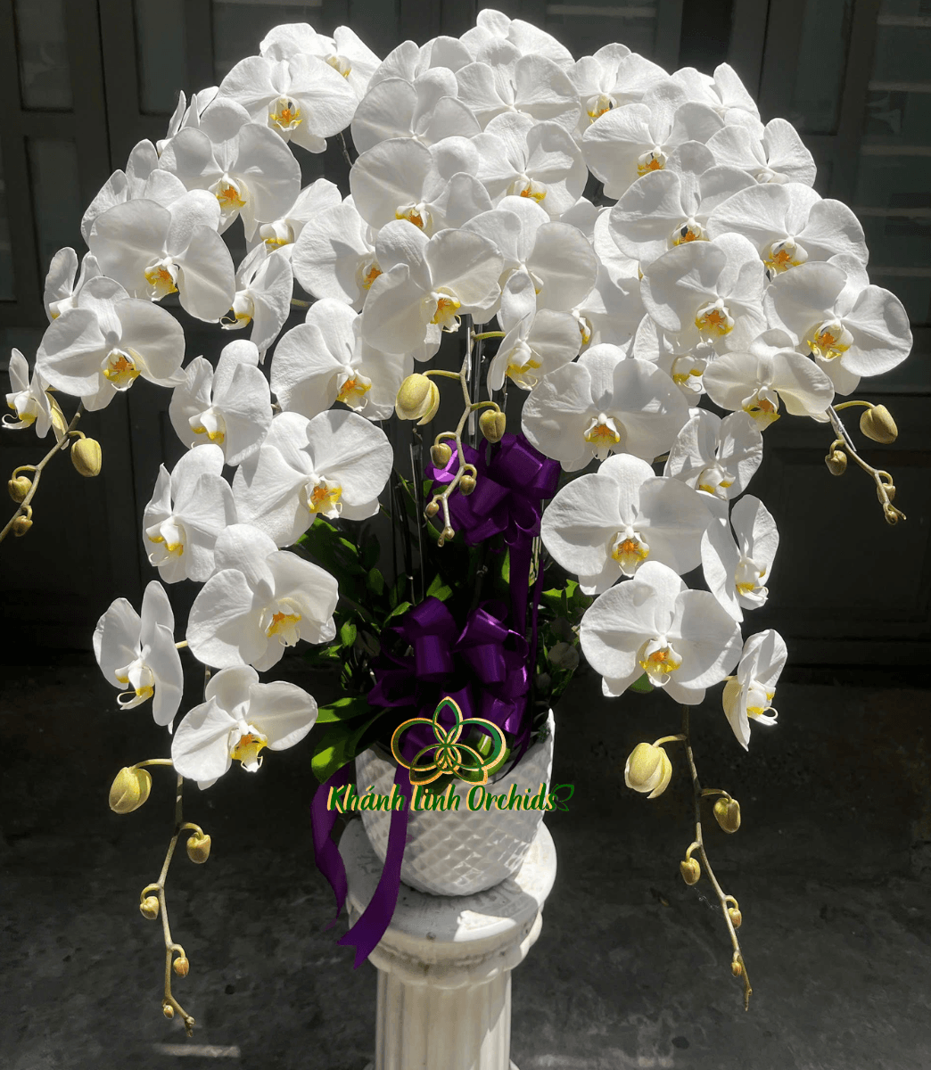 Những bông hoa nở đều, cánh hoa dày, bề mặt mịn và form hoa tròn đầy mang lại cảm giác chỉnh chu, gọn gàng. Xen kẽ giữa các bông là những nụ hoa còn khép, thể hiện sự tiếp nối và trọn vẹn trong một vòng đời. Phần lá xanh được giữ tự nhiên, làm nền cho sắc trắng nổi bật, đồng thời giúp tổng thể chậu lan thêm phần cân đối.