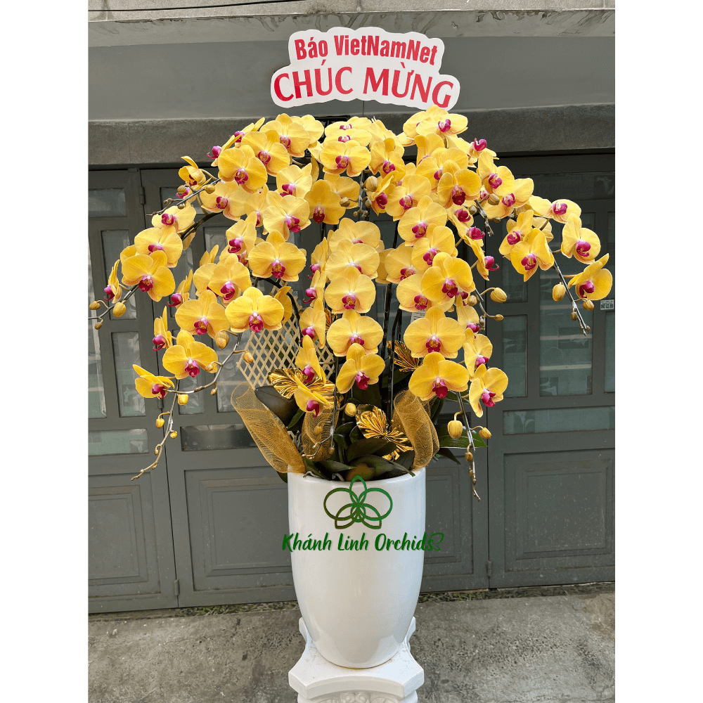 Sự kết hợp giữa màu vàng nghệ mạnh mẽ của hoa và chậu trắng thanh thoát tạo nên một tổng thể hài hòa về màu sắc và phong cách. Với chiều cao vừa phải và dáng cắm gọn gàng, chậu lan này là lựa chọn hoàn hảo để trang trí không gian như phòng khách, bàn làm việc, hoặc các sự kiện quan trọng, mang lại sự may mắn và thịnh vượng cho gia chủ.