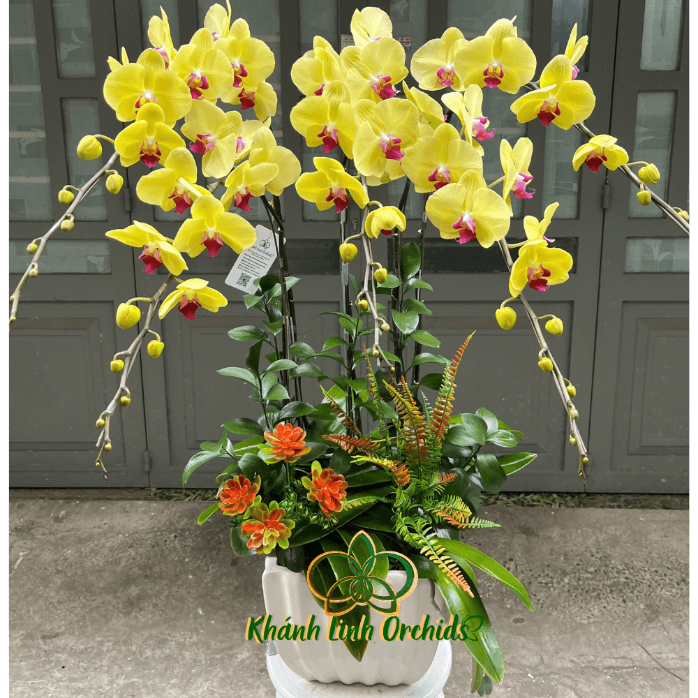 Ngoài những cành hoa Lan Hồ Điệp vàng, chậu hoa còn được trang trí thêm với những cây sen đá giả và cây dương xỉ, tạo thêm sự tươi mới và nét đẹp tự nhiên. Các cây sen đá với hình dáng nhỏ nhắn, xinh xắn cùng cây dương xỉ xanh mướt không chỉ làm tăng thêm vẻ đẹp của chậu hoa mà còn giúp tạo ra sự cân bằng giữa sắc màu tươi sáng và sự tĩnh lặng.