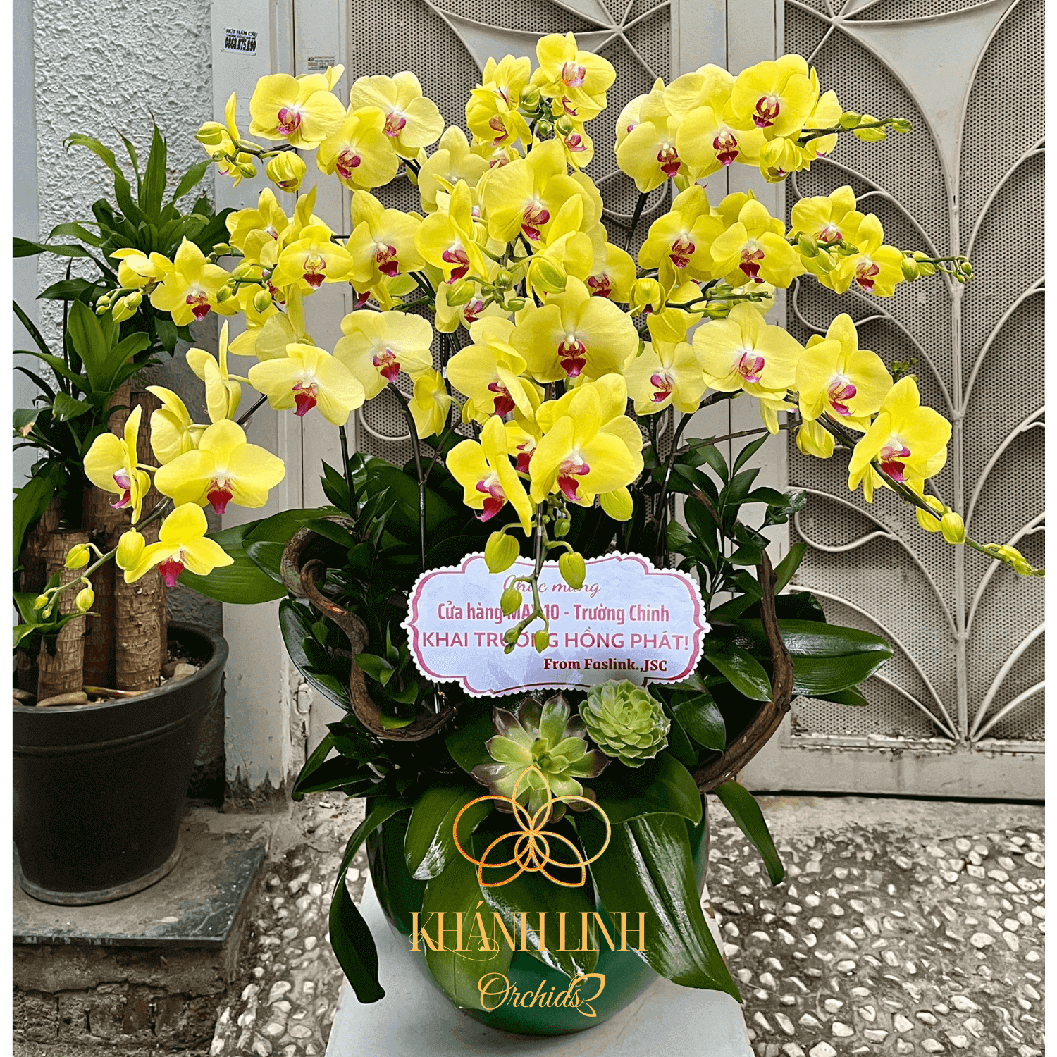 Chậu Lan Hồ Điệp Vàng 12 Cành là một tác phẩm thiên nhiên tinh tế, tỏa sáng với vẻ đẹp kiêu sa và quý phái. Mỗi cành hoa lan rực rỡ màu vàng như những tia nắng cuối thu, phản chiếu ánh sáng ấm áp và sự lạc quan của mùa xuân. Nét đẹp của chậu lan không chỉ nằm ở sự tinh tế của từng bông hoa, mà còn ở sự uyển chuyển và độc đáo của từng cành. Cánh hoa lan mềm mại, được thợ cắm một cách khéo léo, cong vút, tạo nên một khung cảnh lãng mạn và tinh tế.