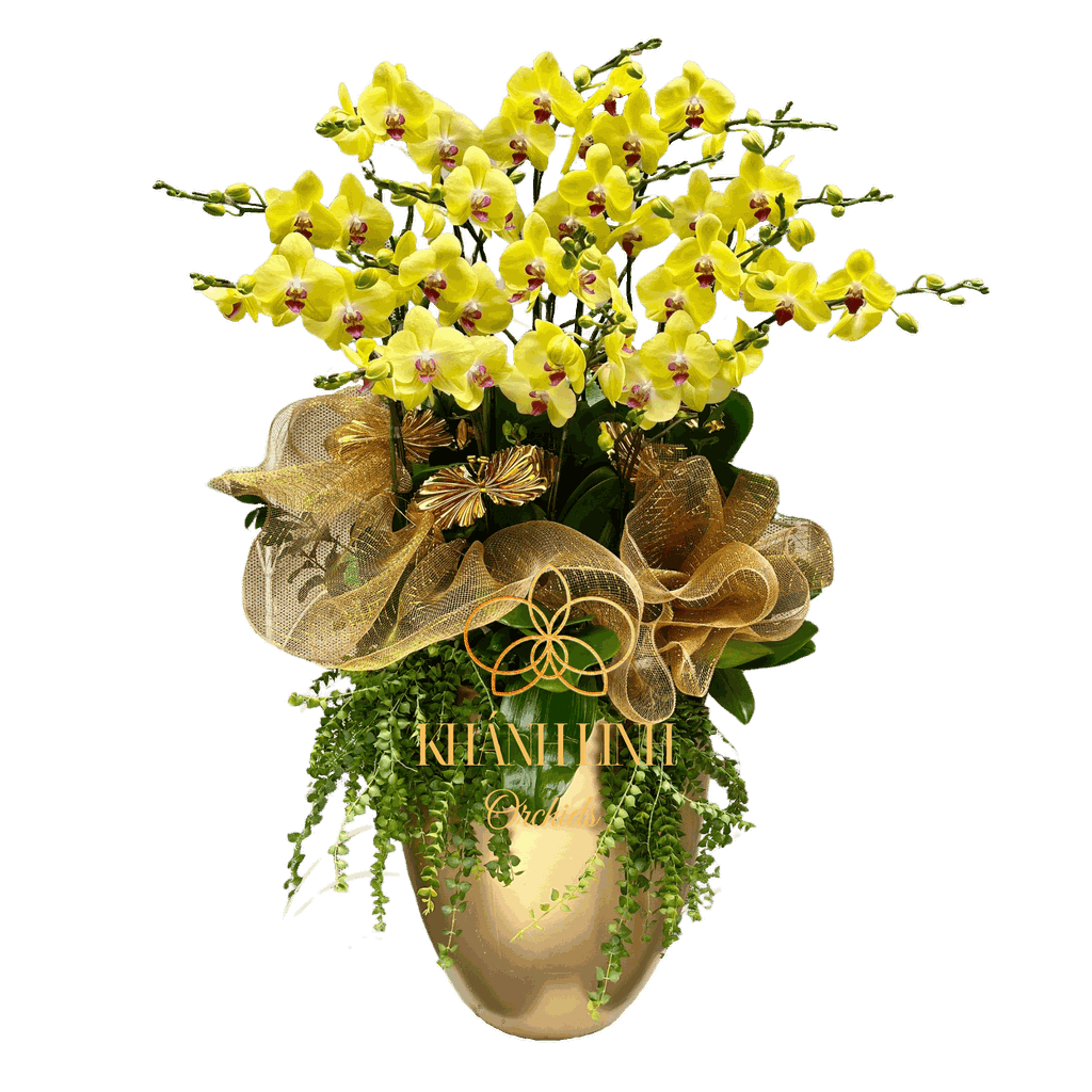 Các cành hoa uốn lượn mềm mại và mảnh mai, tạo nên một hình dáng tráng lệ và quyến rũ. Bức tranh của chậu hoa vàng như là một tác phẩm nghệ thuật thiên nhiên, nơi mà mỗi chi tiết đều tỏa sáng, tạo nên một không gian thần tiên và quý phái. Lá cây xanh mướt xung quanh như là bức bình phong nhẹ nhàng, làm nổi bật sự rực rỡ của hoa vàng. Sự kết hợp hài hòa giữa màu vàng và xanh tạo ra một bức tranh tự nhiên huyền bí, nơi mà vẻ đẹp tinh tế và quý phái được tôn lên đúng giá trị của mình. Chậu lan hồ điệp vàng 15 cành không chỉ là một sản phẩm trang trí, mà còn là biểu tượng của vẻ đẹp và tinh tế. Nó là nguồn cảm hứng và niềm say mê cho những người yêu thích vẻ đẹp của thiên nhiên.