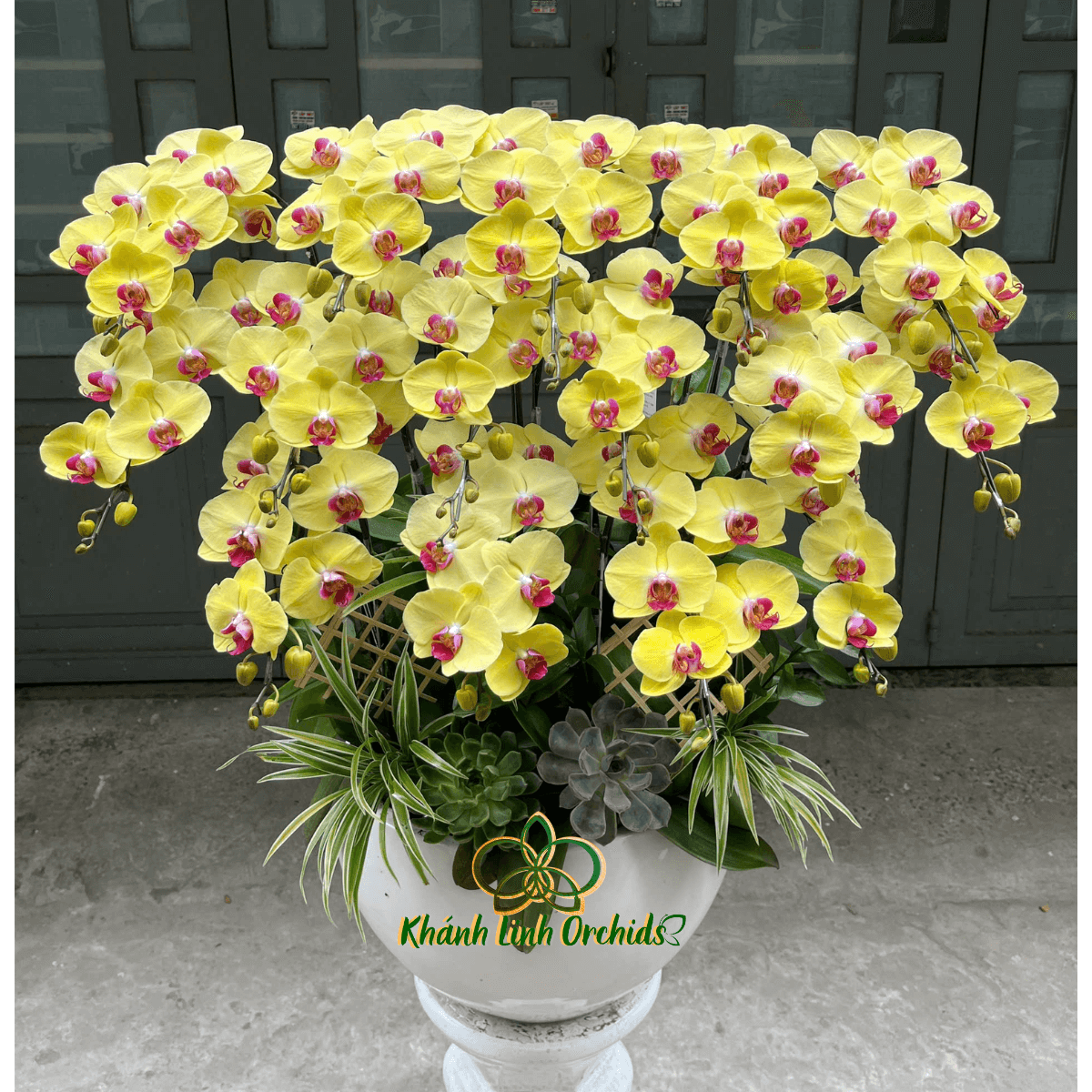 Lan hồ điệp vàng là màu sắc tượng trưng cho sự thịnh vượng, thành công, phú quý và nguồn năng lượng tích cực. Một chậu lan vàng 15 cành rực rỡ như thế này không chỉ đẹp trong trưng bày mà còn mang ý nghĩa chúc phúc sâu sắc – rất phù hợp cho các dịp khai trương, tân gia, chúc mừng đối tác, tri ân khách hàng hoặc trang trí không gian sang trọng.