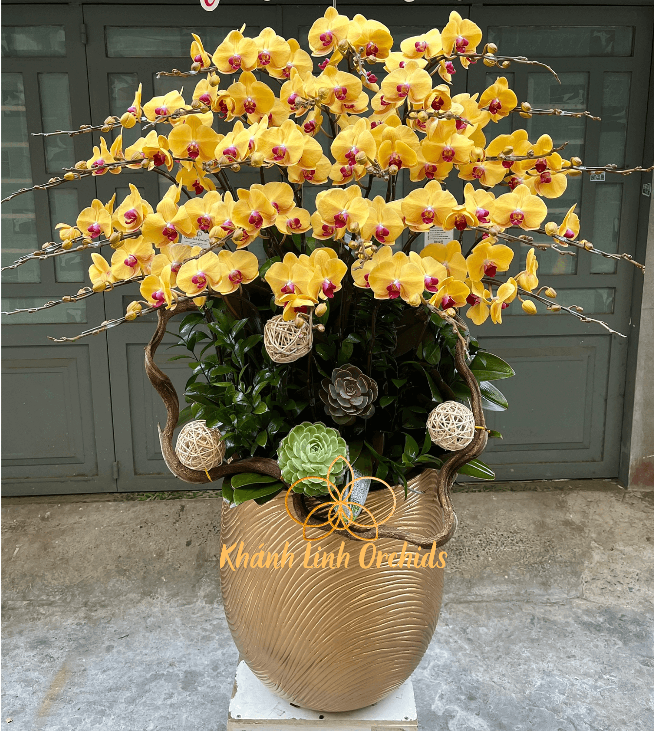 Điểm đặc biệt của chậu lan này là được cắm vào chậu xi măng nhẹ cao cấp, phun màu vàng đồng sang trọng. Sự kết hợp giữa sắc vàng của hoa và màu vàng đồng của chậu tạo nên một tổng thể đầy quyền lực và đẳng cấp. Chất liệu xi măng nhẹ không chỉ tạo nên vẻ vững chắc mà còn làm nổi bật sự tinh tế và sang trọng của chậu hoa.