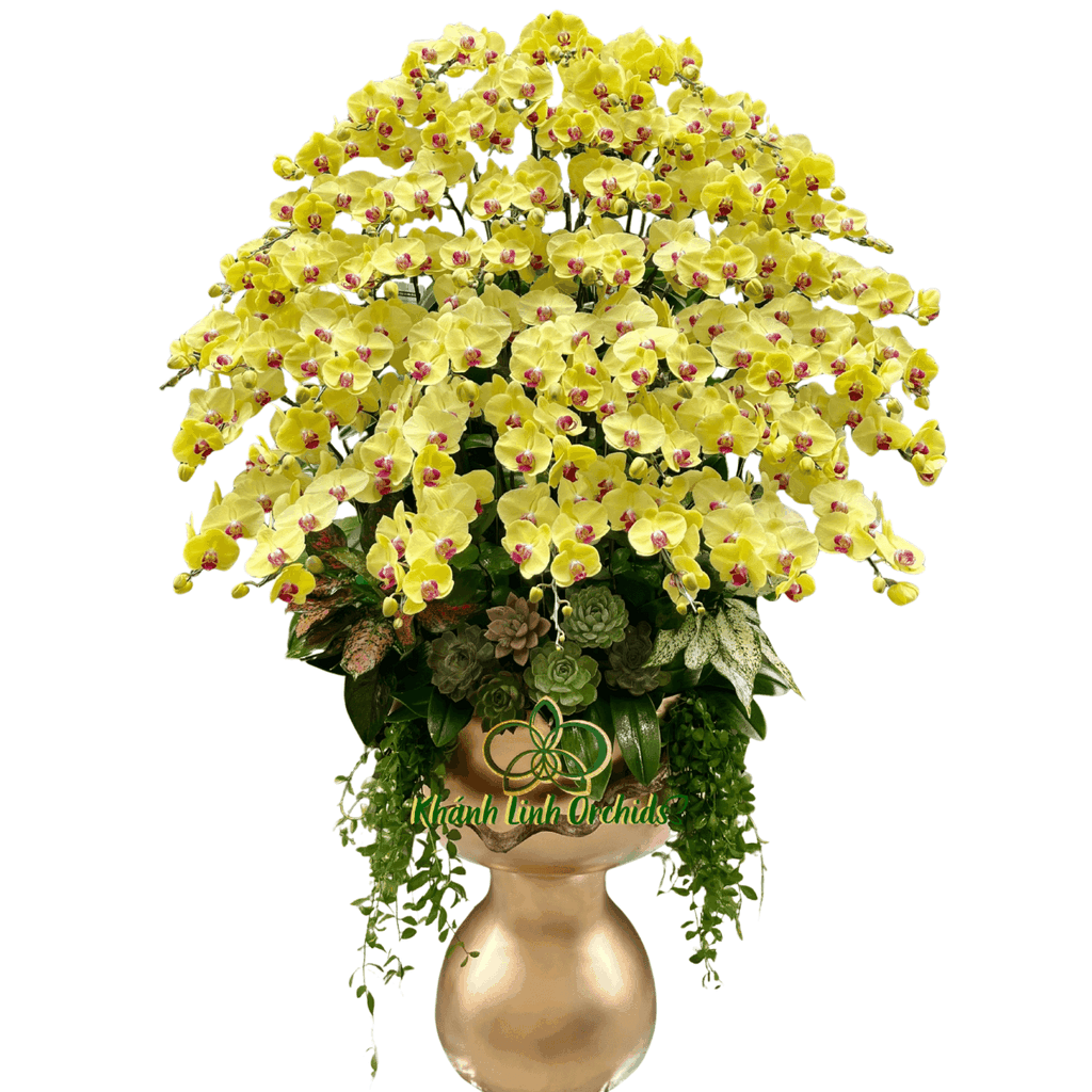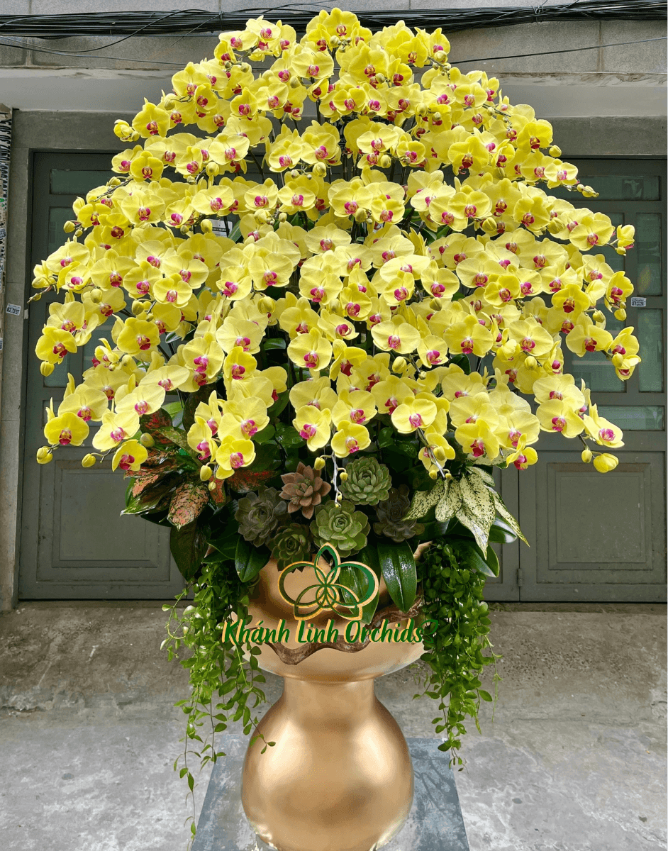 Chậu lan hồ điệp vàng 50 cành là một tác phẩm nổi bật với quy mô lớn và bố cục dày, phù hợp trưng bày tại sảnh công ty, khu vực lễ tân, showroom hoặc không gian cần tạo ấn tượng rõ ràng. Tổng thể chậu lan mang lại cảm giác đầy đặn, cân đối và thu hút ngay từ ánh nhìn đầu tiên.