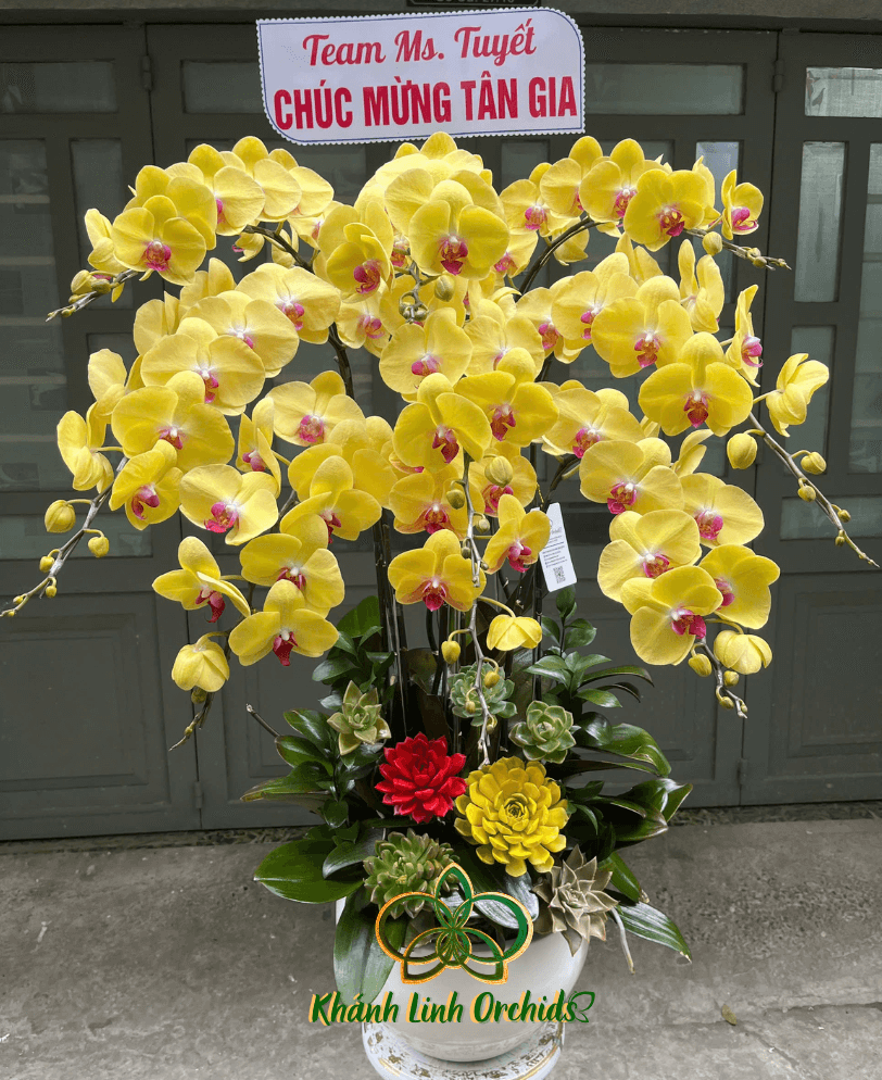 Điểm xuyết quanh gốc hoa là sen đá được phun màu vàng và đỏ, hài hòa với sắc màu của hoa, làm tăng thêm vẻ tươi sáng và sinh động. Chậu hoa Lan Hồ Điệp này là sự kết hợp hoàn hảo giữa nét đẹp thiên nhiên mạnh mẽ và vẻ kiêu sa tinh tế, phù hợp để tô điểm cho mọi không gian thêm phần lộng lẫy và thanh lịch.