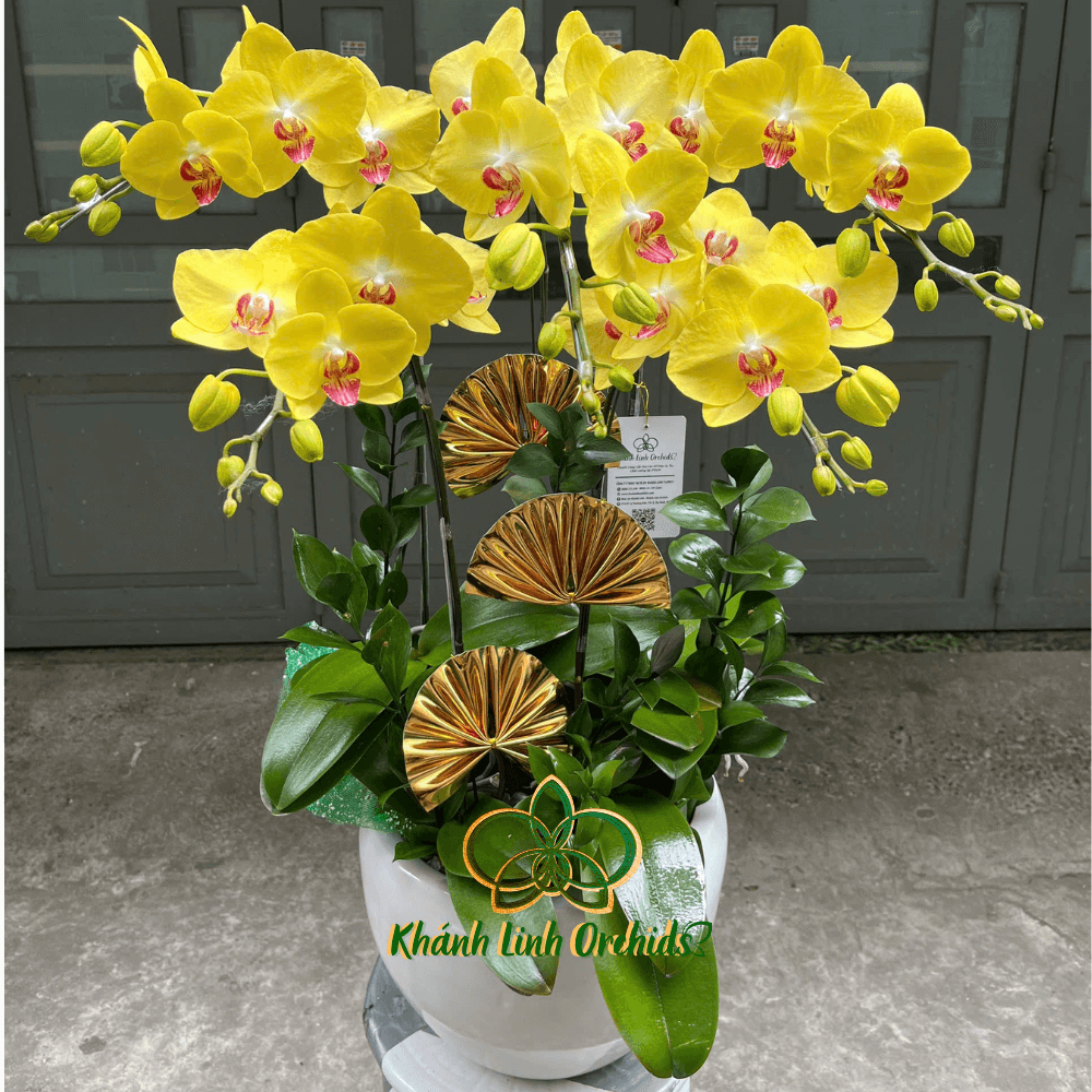 Chậu hoa được cắm trong chiếc chậu trắng thấp, tạo sự tương phản hoàn hảo, làm nổi bật sắc vàng tươi sáng của hoa. Chậu trắng thanh thoát mang lại cảm giác thanh bình, đồng thời làm tăng thêm vẻ đẹp rực rỡ của Lan Hồ Điệp. Đặc biệt, xung quanh chậu, những chiếc quạt màu vàng đồng được trang trí khéo léo, tạo điểm nhấn sang trọng và ấm áp, như một lời chúc phúc cho những người xung quanh. Lá xanh mướt được xếp gọn gàng quanh gốc cây, thêm phần tươi mới và gần gũi với thiên nhiên. Sự kết hợp giữa hoa Lan Hồ Điệp Vàng Chanh, chậu trắng, quạt vàng đồng và lá xanh tạo nên một không gian vừa thanh thoát, vừa ấm áp, mang lại cảm giác an lành, thịnh vượng và đầy hy vọng.