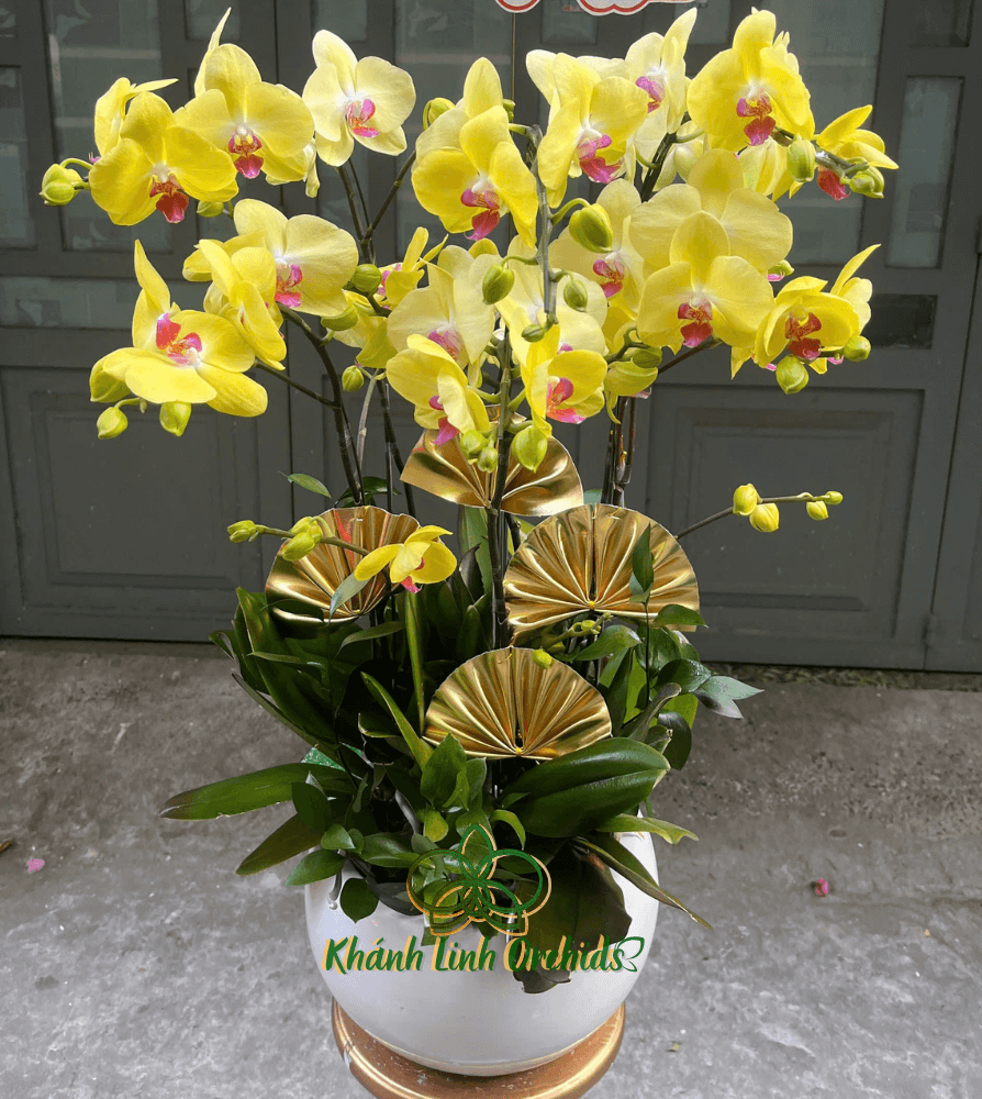 Chậu hoa được cắm trong một chiếc chậu trắng thấp, sang trọng nhưng giản dị. Chậu trắng như một sự tôn vinh vẻ đẹp của hoa lan, không làm lu mờ mà còn làm tăng thêm sự lấp lánh của những cánh hoa vàng.