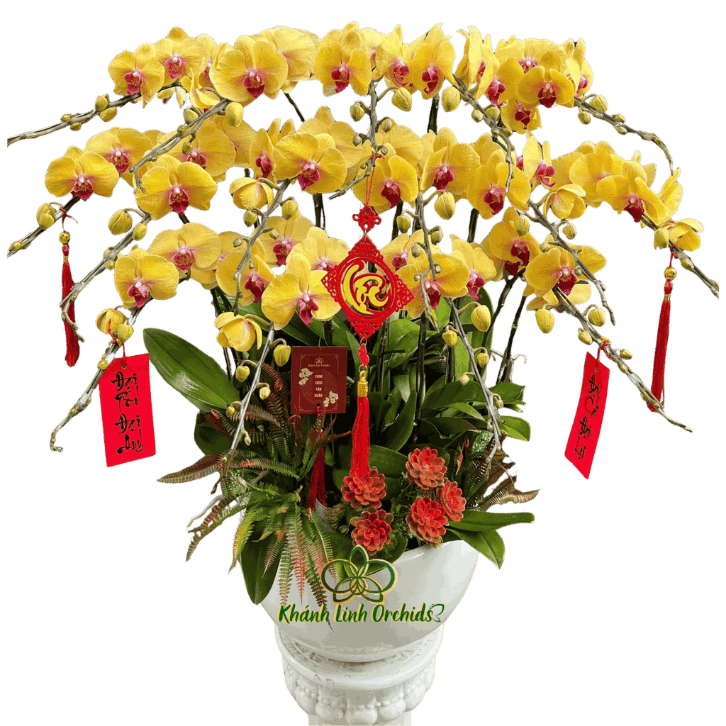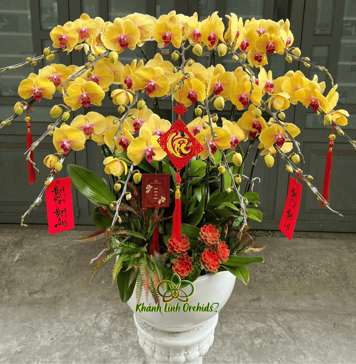 Chậu lan hồ điệp vàng nghệ 15 cành không chỉ là điểm nhấn trang trí sang trọng cho dịp Tết mà còn là món quà ý nghĩa gửi gắm lời chúc năm mới an khang, phát đạt, vạn sự như ý và hạnh phúc trọn vẹn đến gia chủ, đối tác hay người thân yêu.