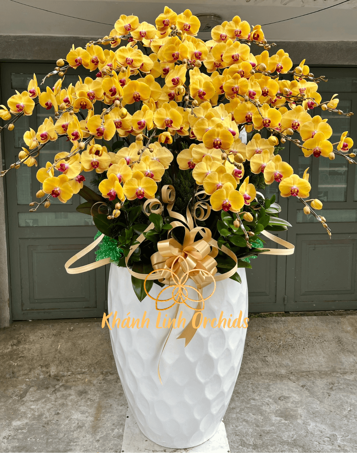 Vẻ đẹp quý phái của chậu lan hồ điệp Vàng Nghệ 25 Cành không chỉ đến từ sắc vàng rực rỡ, mà còn từ hình dáng tinh xảo và sự tươi mới của mỗi bông hoa. Các cành hoa lan hồ điệp được các nghệ nhân từ nhà Hoa lan Khánh Linh cắm và sắp xếp một cách hài hòa, tạo nên một hình ảnh hoàn mỹ và lấp lánh, khiến mọi ánh nhìn đều không thể rời mắt khỏi.