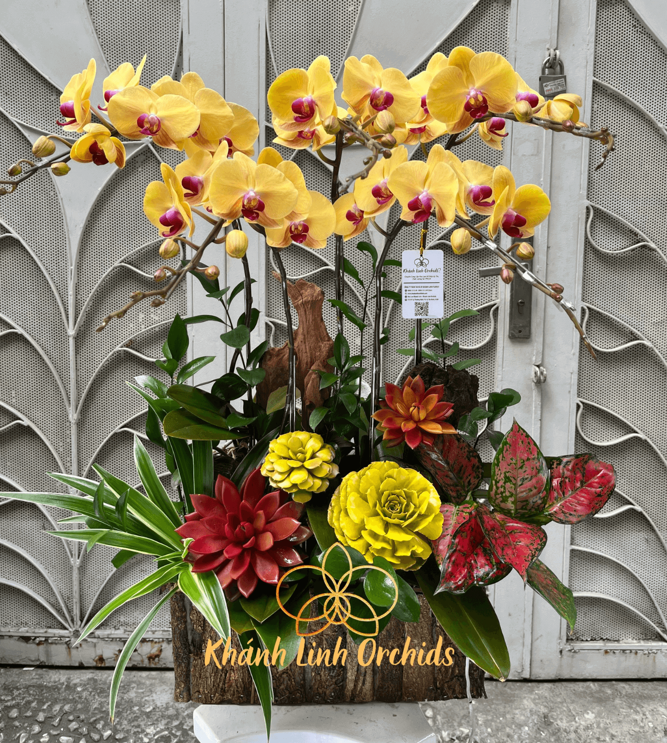Những bông hoa lan toát lên vẻ đẹp kiêu sa và lộng lẫy, nhưng cũng không kém phần dịu dàng và thuần khiết. Bên cạnh đó, trang trí sen đá được đặt xen kẽ giữa các cành hoa, tạo điểm nhấn tuyệt vời và làm cho không gian trở nên hài hòa hơn bao giờ hết. Hộp gỗ lan hồ điệp màu vàng 5 cành kết hợp trang trí sen đá không chỉ là một sản phẩm trang trí mà còn là biểu tượng của sự sang trọng và đẳng cấp, làm cho không gian sống của bạn trở nên đẹp đẽ và ấn tượng.