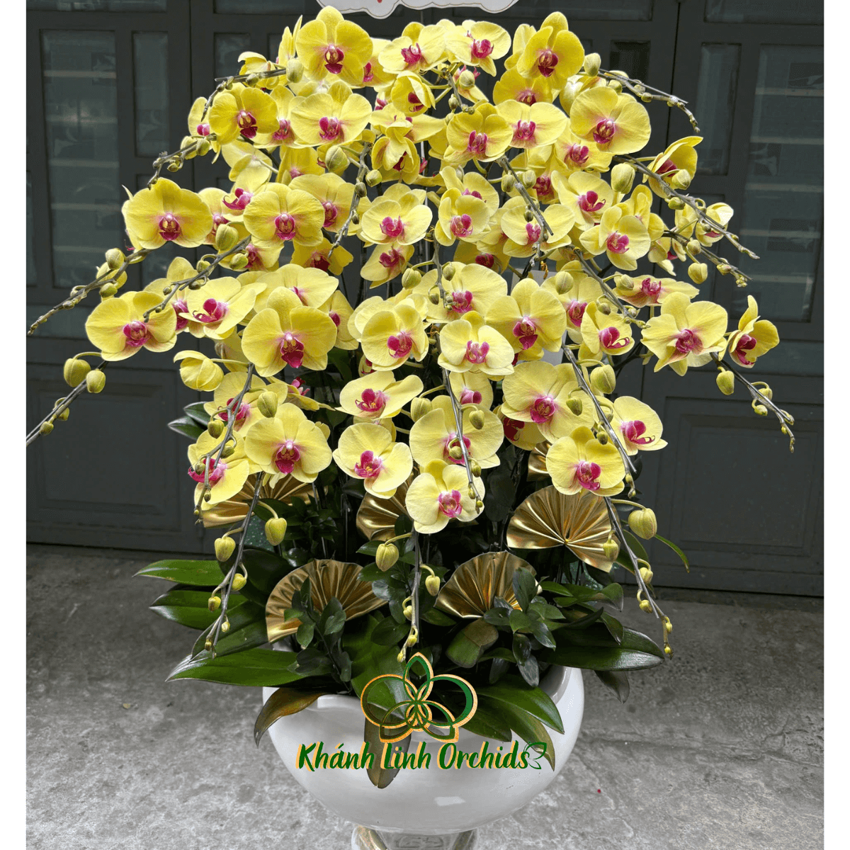 Chậu Lan Hồ Điệp Vàng Thần Tài 20 Cành là biểu tượng rực rỡ của tài lộc, may mắn và sự thịnh vượng bền lâu. Với tổng cộng 20 cành lan hồ điệp vàng thần tài được tuyển chọn kỹ lưỡng, chậu hoa mang hình ảnh của sự viên mãn, sung túc và phát triển không ngừng.
