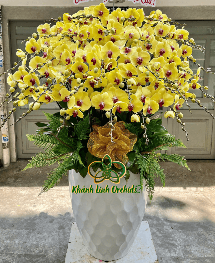 Cắm trong chậu xi măng nhẹ hình lập phương màu trắng, chiều cao tổng thể đạt từ 1m6 đến 1m7, tạo nên một điểm nhấn nổi bật trong mọi không gian. Phía dưới gốc lan, lớp lá dương xỉ xanh mướt được phủ khéo léo, tôn lên vẻ đẹp tự nhiên của hoa. Bông hoa được thợ trang trí bằng lưới thủ công màu vàng đồng, vừa sang trọng vừa tinh tế, tạo thêm nét độc đáo, góp phần làm cho chậu hoa Lan Hồ Điệp này trở thành món quà ý nghĩa, mang lại sự may mắn và phú quý cho người nhận. Với vẻ đẹp rực rỡ và ý nghĩa sâu sắc, đây chắc chắn là một lựa chọn không thể thiếu cho những ai yêu thích sự sang trọng và tinh tế.