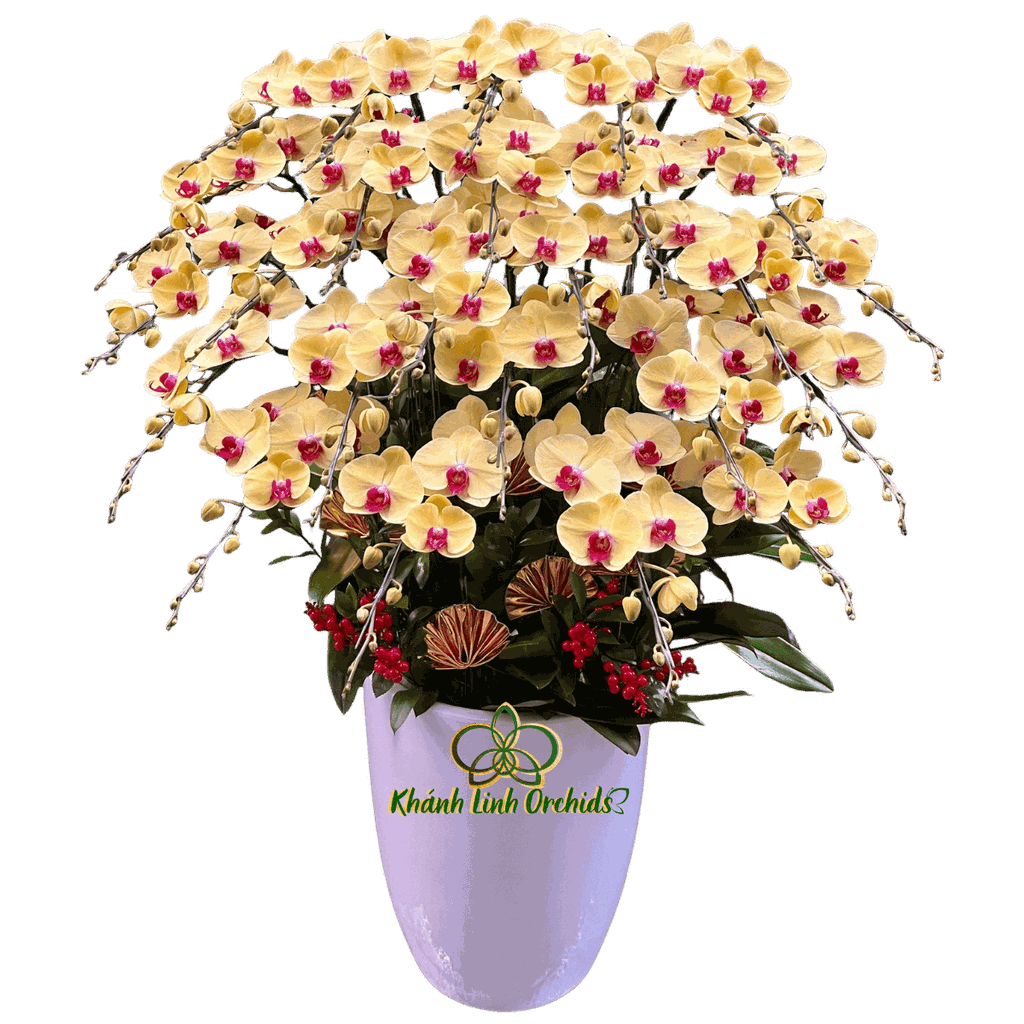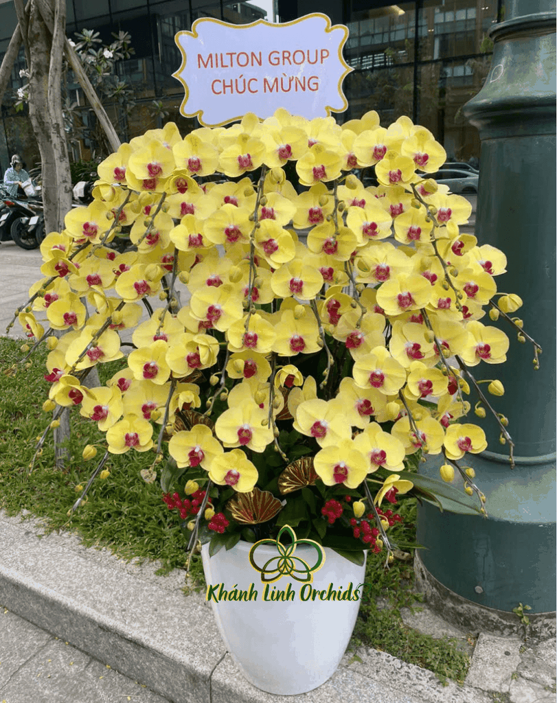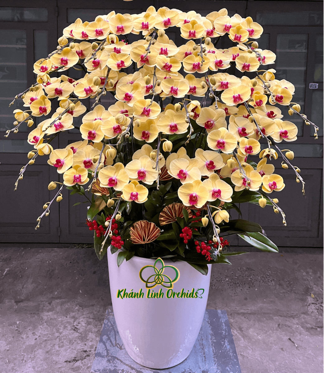 Với 25 cành lan, bố cục chậu hoa thể hiện sự bề thế và sang trọng. Các tầng hoa được phân bổ hợp lý, giúp tổng thể không bị rối mà vẫn giữ được sự mềm mại. Phần trang trí được điểm xuyết bằng quạt vàng và trái đông đào đỏ, mang lại cảm giác ấm áp và nổi bật, đồng thời tăng thêm chiều sâu cho thiết kế. Sự kết hợp giữa sắc vàng của hoa và các chi tiết trang trí tạo nên một tổng thể hài hòa, phù hợp với những dịp quan trọng.