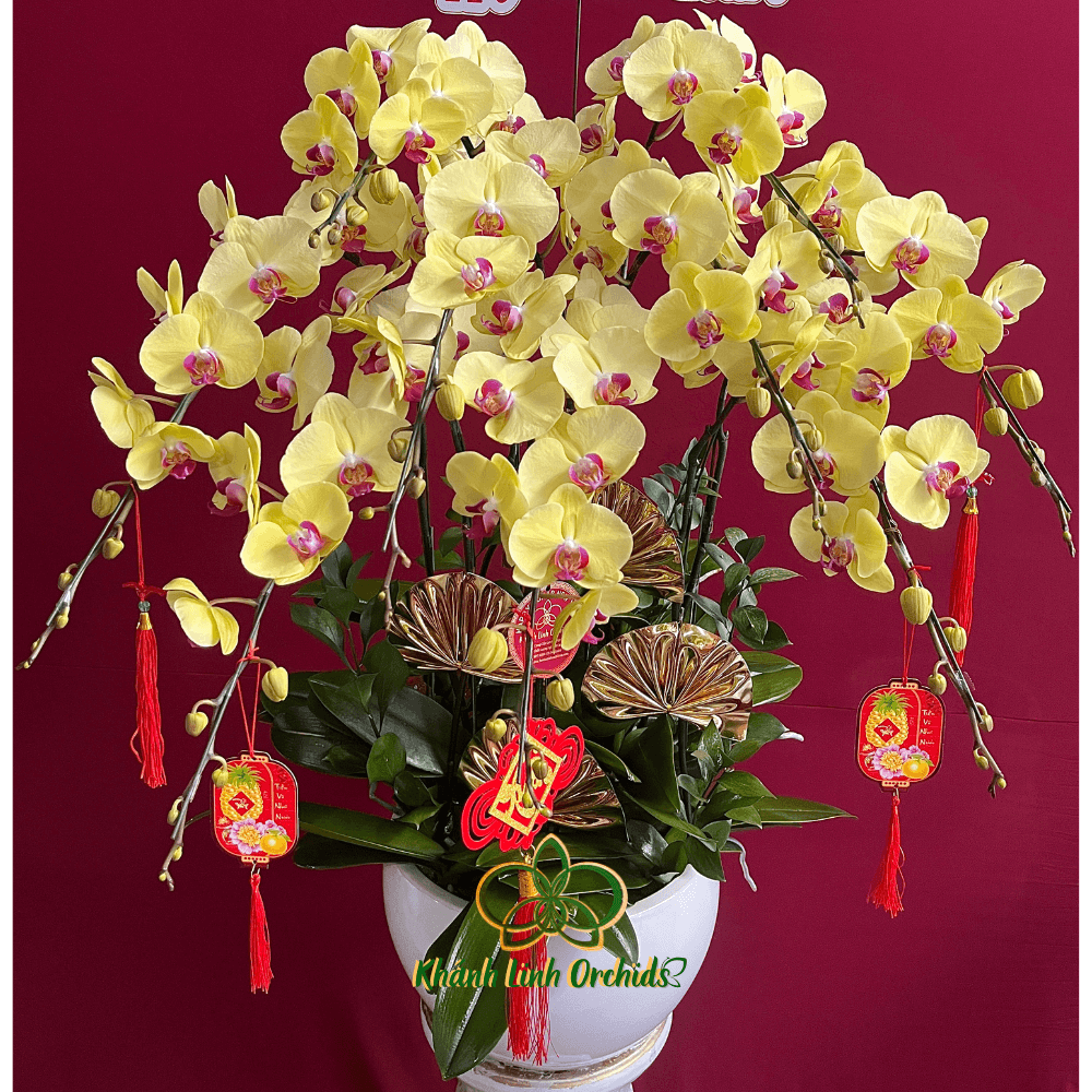 Chậu hoa được cắm trong một chậu trắng thấp, đơn giản nhưng thanh thoát, tạo nền tôn lên sắc vàng của hoa, làm chúng càng thêm nổi bật và lộng lẫy. Chậu trắng làm nổi bật vẻ đẹp tinh tế, nhẹ nhàng của hoa, khiến toàn bộ chậu hoa trở nên hài hòa và thanh thoát. Điểm nhấn đặc biệt là trang trí liễng Tết, thêm phần ấm áp và may mắn cho không gian. Chậu hoa Lan Hồ Điệp Vàng Tươi 9 Cành là món quà hoàn hảo cho những dịp lễ, tết, mang lại sự tươi mới, tài lộc và những điều tốt đẹp cho người nhận.