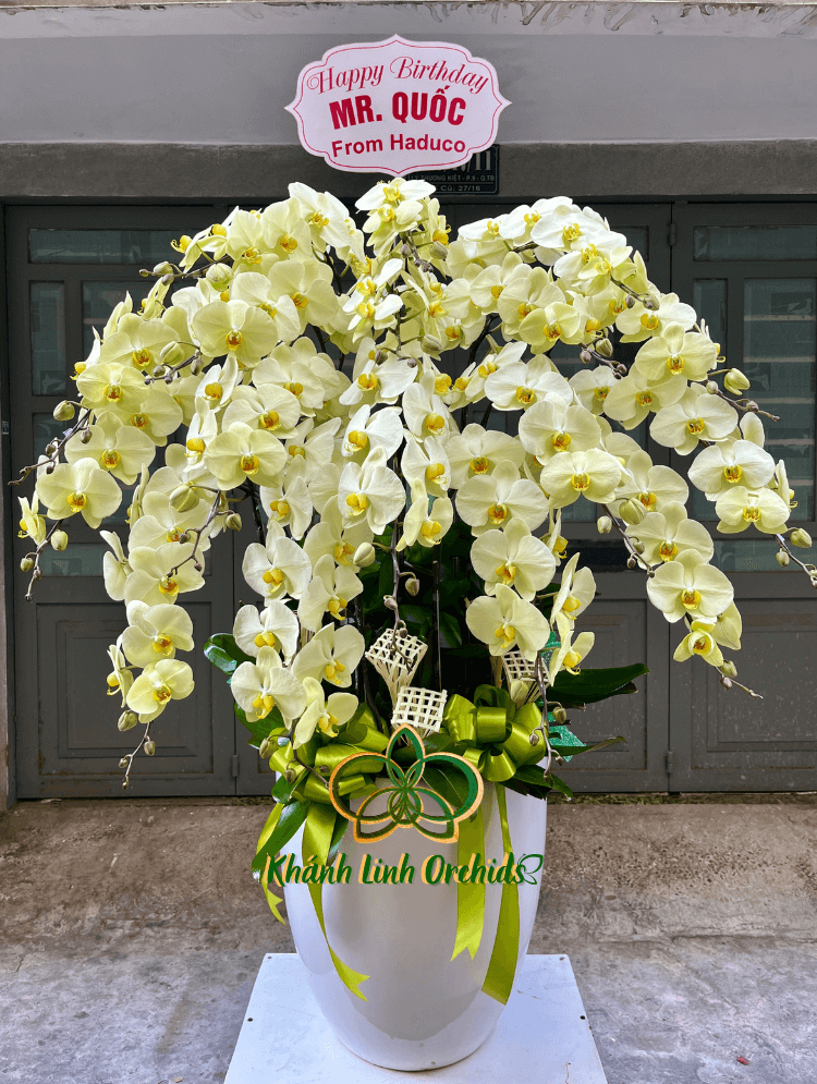Chậu Lan Hồ Điệp xanh bơ không chỉ mang vẻ đẹp thanh thoát khi được cắm trong chậu cao trắng, là lựa chọn lý tưởng cho các không gian sang trọng như phòng khách, sảnh lớn hoặc làm quà biếu cao cấp.