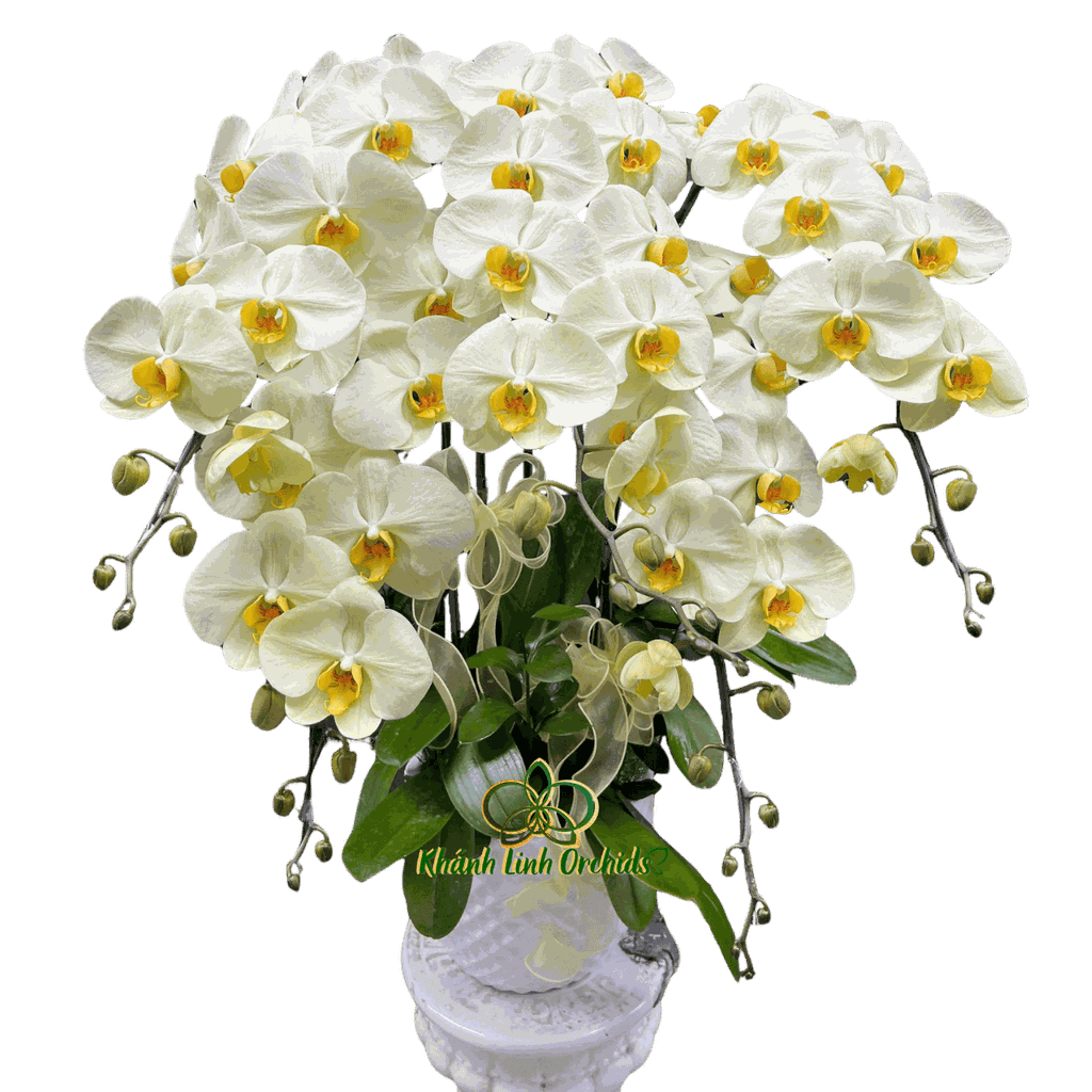 Năm cành lan được sắp xếp theo dáng cong tự nhiên, đan xen giữa những bông nở rộ và các nụ hoa còn chúm chím, mang lại vẻ mềm mại và tràn đầy sức sống. Số lượng 5 cành vừa đủ tạo nên sự gọn gàng, tinh tế mà không quá phô trương, rất phù hợp để trưng bày trên bàn tiếp khách, quầy lễ tân, bàn làm việc hoặc không gian phòng khách hiện đại.