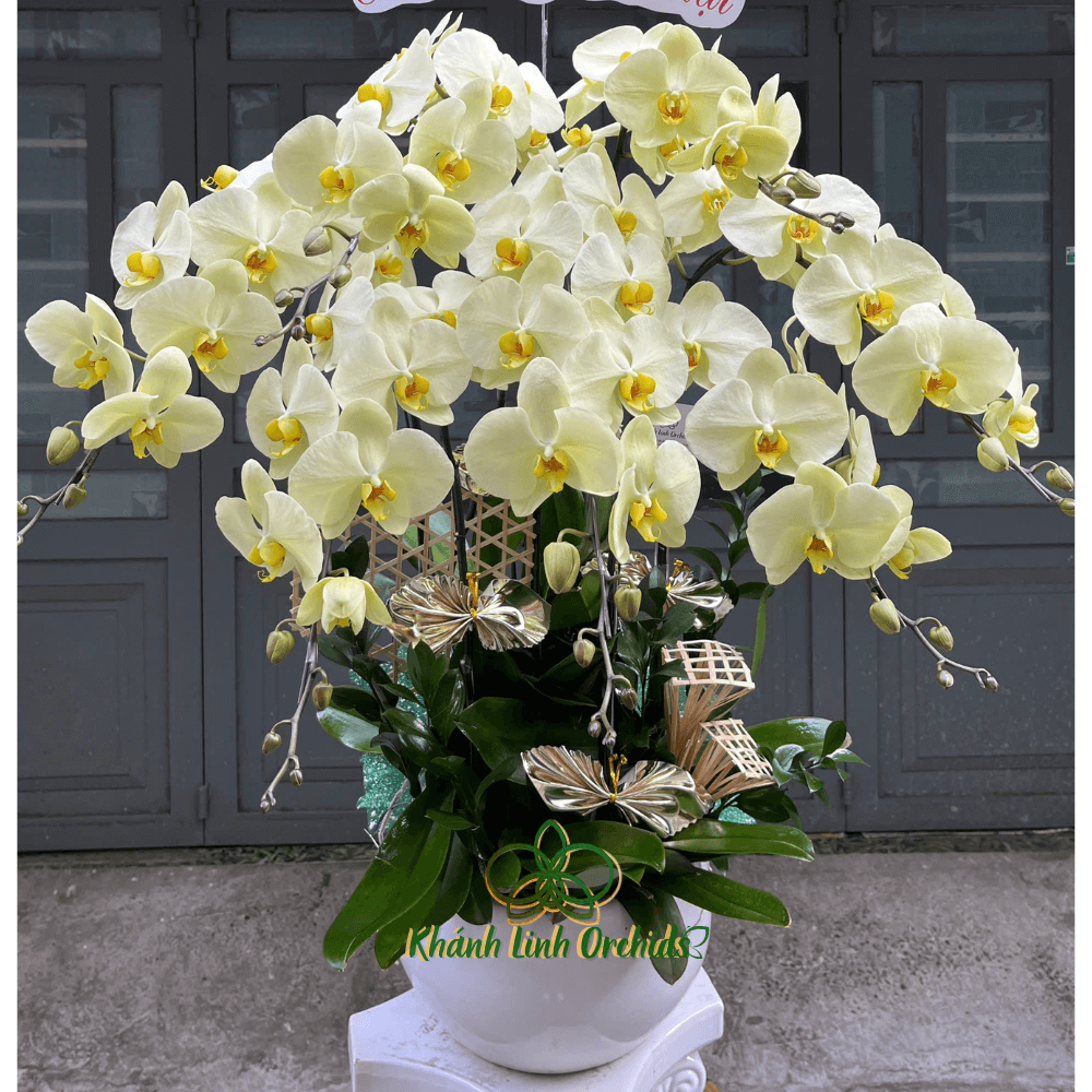 Bảy cành lan được khéo léo cắm trong chậu trắng thấp, giúp tôn lên vẻ đẹp thanh khiết của hoa và tạo sự cân bằng thị giác. Chậu trắng không chỉ mang lại sự tinh giản, trang nhã mà còn làm nổi bật sắc xanh bơ dịu nhẹ, giúp tổng thể chậu hoa thêm phần hài hòa và thanh thoát. Điểm nhấn đặc biệt của chậu hoa chính là tre đan và hình ảnh những cánh bướm bay lượn, tạo nên một không gian nghệ thuật đầy thơ mộng và bay bổng. Tre đan mộc mạc tượng trưng cho sự bền vững, gắn kết, trong khi những cánh bướm xinh xắn thể hiện sự tự do, thanh thoát và tinh thần lạc quan.