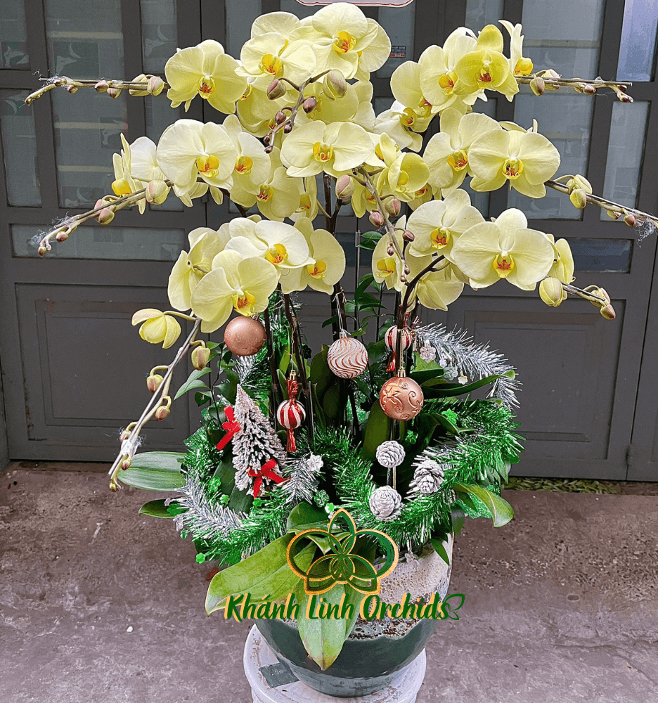 Được cắm trong một chiếc chậu đá xanh rêu họa tiết tinh xảo, vừa cổ điển vừa hiện đại. Họa tiết trang trí Noel trên chậu thêm phần ấm áp, mang đến một không khí lễ hội vui tươi, làm bừng sáng không gian với vẻ đẹp tinh khôi của thiên nhiên. Tất cả hòa quyện, tạo nên một tổng thể hoàn hảo khiến bất kỳ ai cũng không thể rời mắt, như một món quà tuyệt vời cho mùa đông thêm ấm áp.