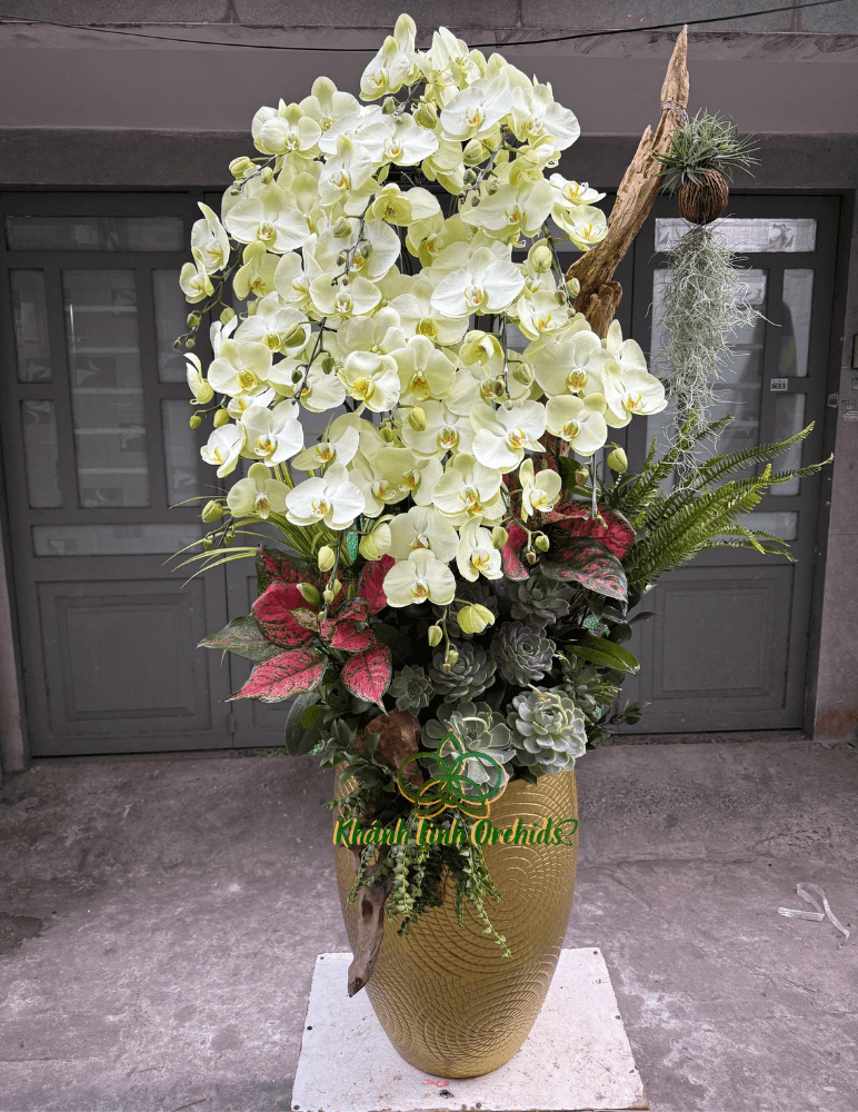 Chậu hoa được cắm trong một chiếc chậu xi măng cao cấp màu vàng đồng, với bề mặt mịn màng và màu sắc sang trọng, mang lại sự nổi bật và quý phái cho toàn bộ tác phẩm. Màu vàng đồng của chậu làm nền hoàn hảo cho sự tươi mới của hoa Lan Hồ Điệp và giúp tạo ra sự tương phản tuyệt vời với sắc xanh của hoa. Đặc biệt, chậu hoa được trang trí thêm một bộ set sen đá, lá đỏ, lũa gỗ, dừa khô treo và lá rũ, tạo nên một không gian gần gũi và sinh động, làm tăng thêm vẻ đẹp tự nhiên và mộc mạc.