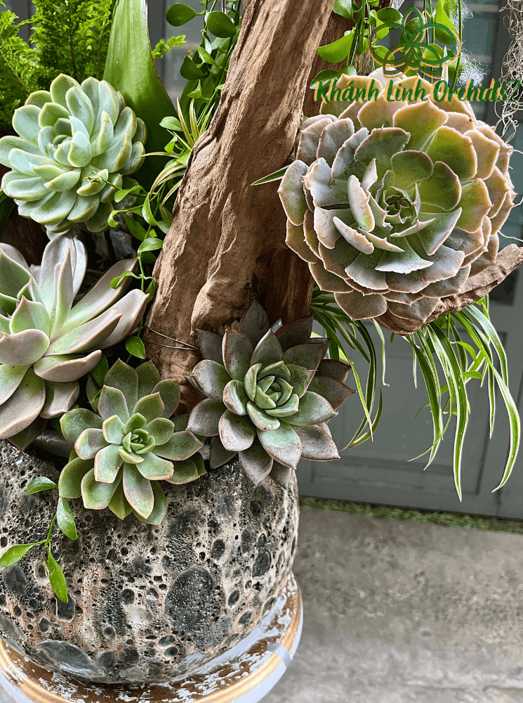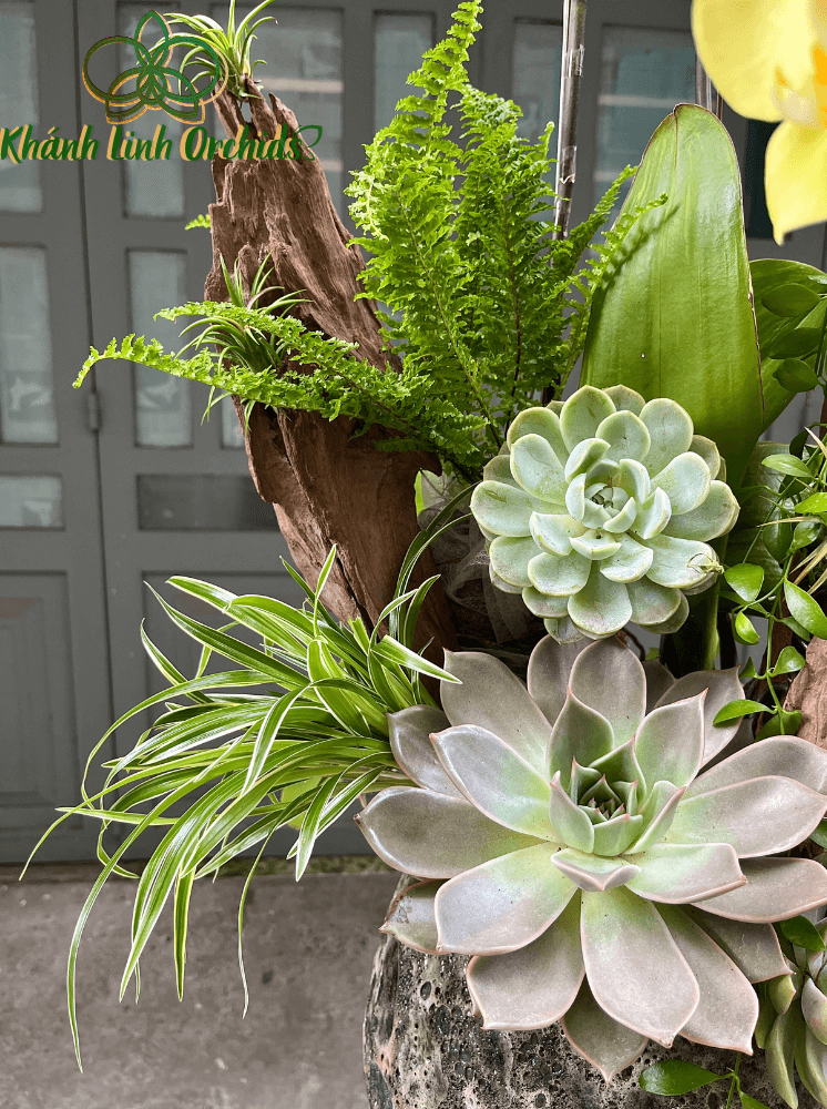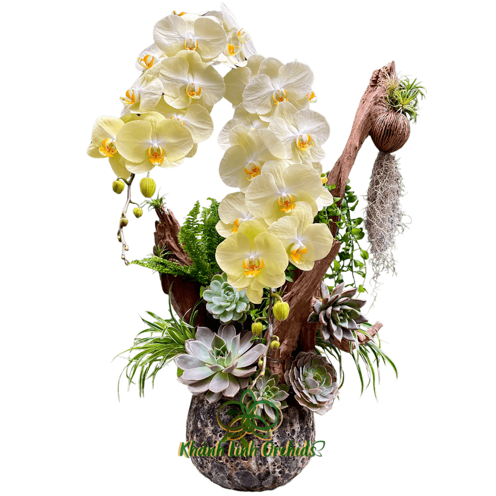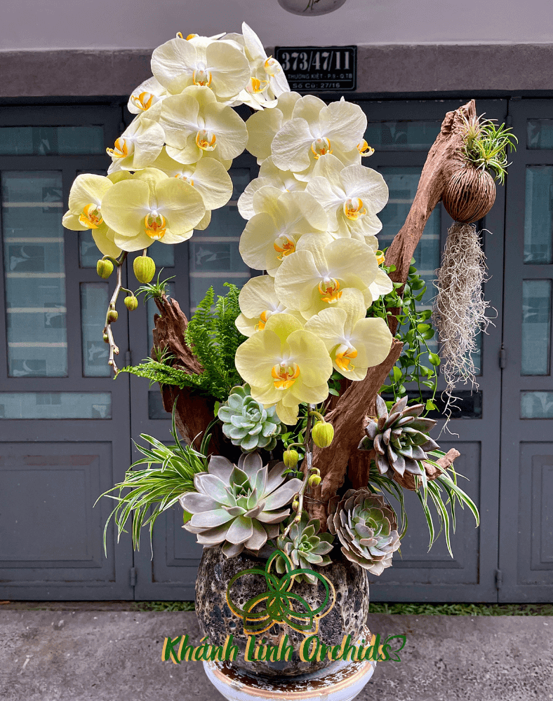 Chậu hoa lan hồ điệp xanh bơ VIP không chỉ dừng lại ở vẻ đẹp của lan hồ điệp, mà còn là sự kết hợp đầy sáng tạo với tiểu cảnh sen đá, lá cảnh, và lũa gỗ.