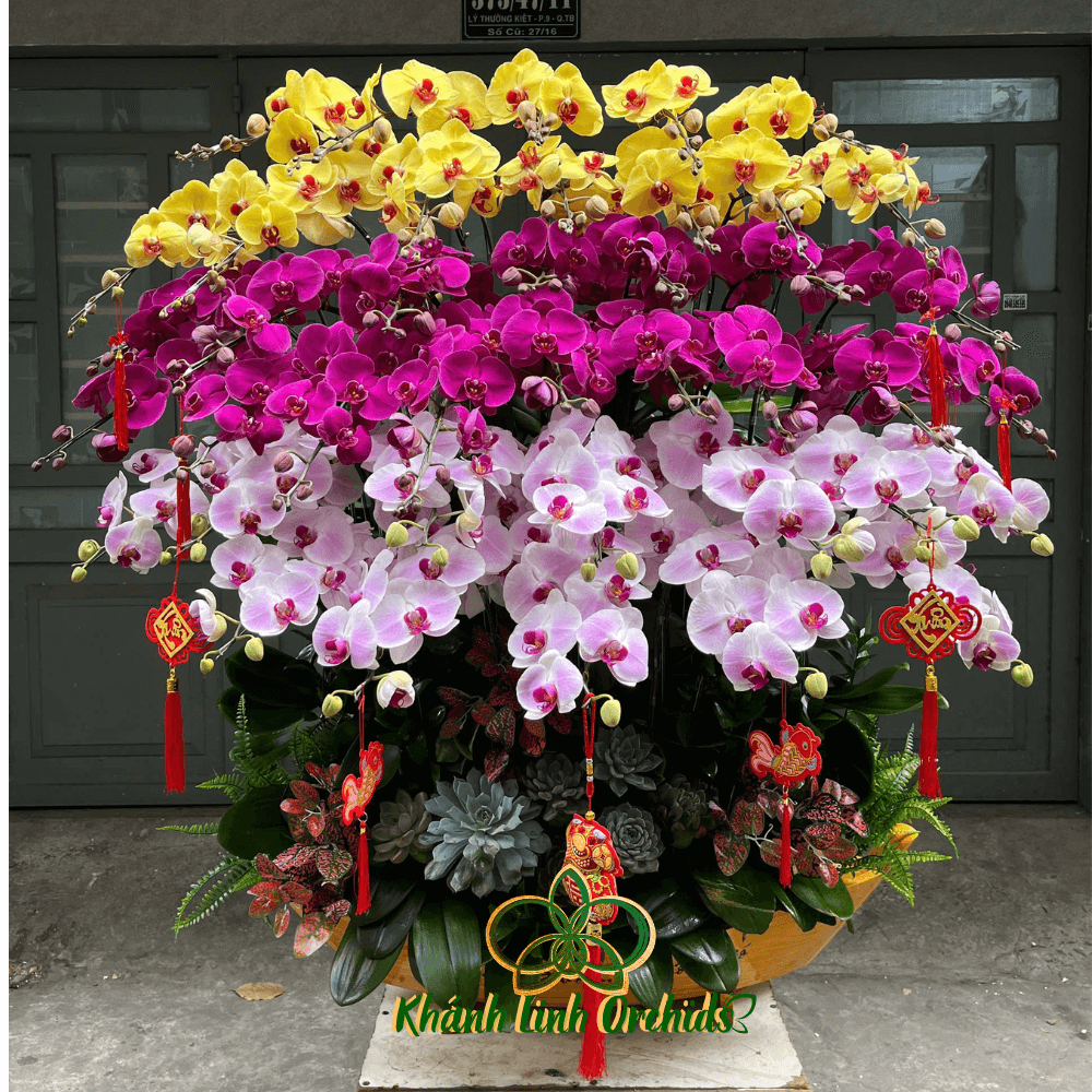 Chậu hoa được đặt trong một chiếc chậu thuyền "Thuận Buồm Xuôi Gió", với hình dáng thuyền tượng trưng cho sự thuận lợi, phát đạt và thành công. Mỗi chi tiết trên chậu thuyền đều được chăm chút tỉ mỉ, tạo nên một tổng thể hoàn hảo, mang đậm giá trị phong thủy. Ngoài ra, sen đá xanh mướt được trang trí xung quanh, tạo sự bền bỉ, kiên cường, kết hợp cùng liễng Tết vàng óng ánh, mang đến không khí ấm cúng và may mắn cho gia đình. Tất cả những yếu tố này không chỉ tạo ra một chậu hoa đầy màu sắc và bắt mắt mà còn chứa đựng những ý nghĩa sâu sắc, cầu chúc một năm mới thuận buồm xuôi gió, an lành và thịnh vượng.
